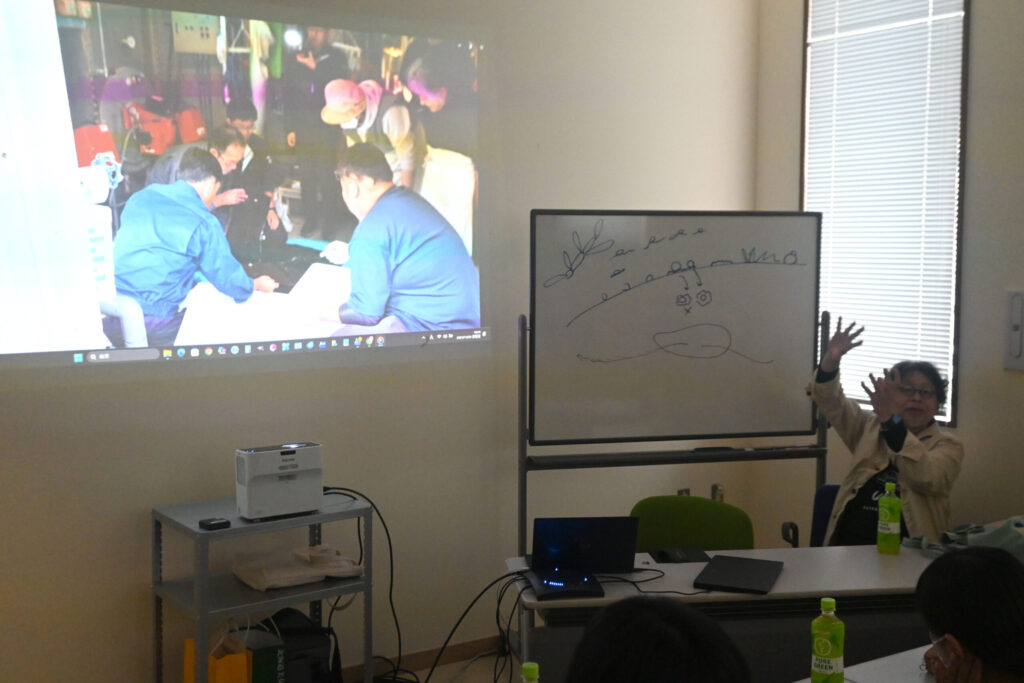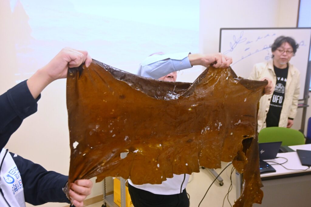 コンブ養殖の基礎をなすコンブの「種づくり」に関する理解促進を図るため、皆で種苗センターの見学を予定していたのですが、種苗センターはどこも土日はお休みなのでありまして…。そこで平日に種苗センターの取材を敢行し、コンブ種苗づくりの一連の流れを「動画」に収め、映像を編集しナレーションも付けて参加者の皆さんにご覧いただきました。目には見えないコンブの胞子が採苗器で培養され、その後急激に種苗へと成長してゆく状況が、動画でわかりやすく伝わったものと思われます。なお、コンブを触ってもらおうと冷凍保存していた母藻を参加者の皆さんの前で広げてみたのですが…すさまじい量のネバネバ成分が切り口から湧き出てきて。これは希望者のみ軽く触れるだけにとどめました。