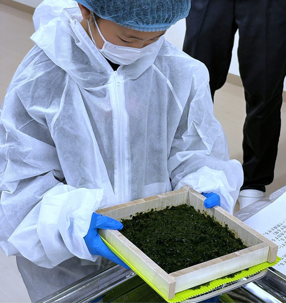 水戻ししたスマートコンブに水を加え、ミキサーをかけて細かく裁断し、それを海苔巻き作りのときに使う「巻き簾(まきす)」に乗せて、正方形に広げて乾燥器に入れ、昆布シートを作る。参加者の皆さんはこの作業を、本当に真剣な面持ちで取り組まれていました(※今回製造した海苔は、十分な乾燥を経た後、皆さんに届けられます)。