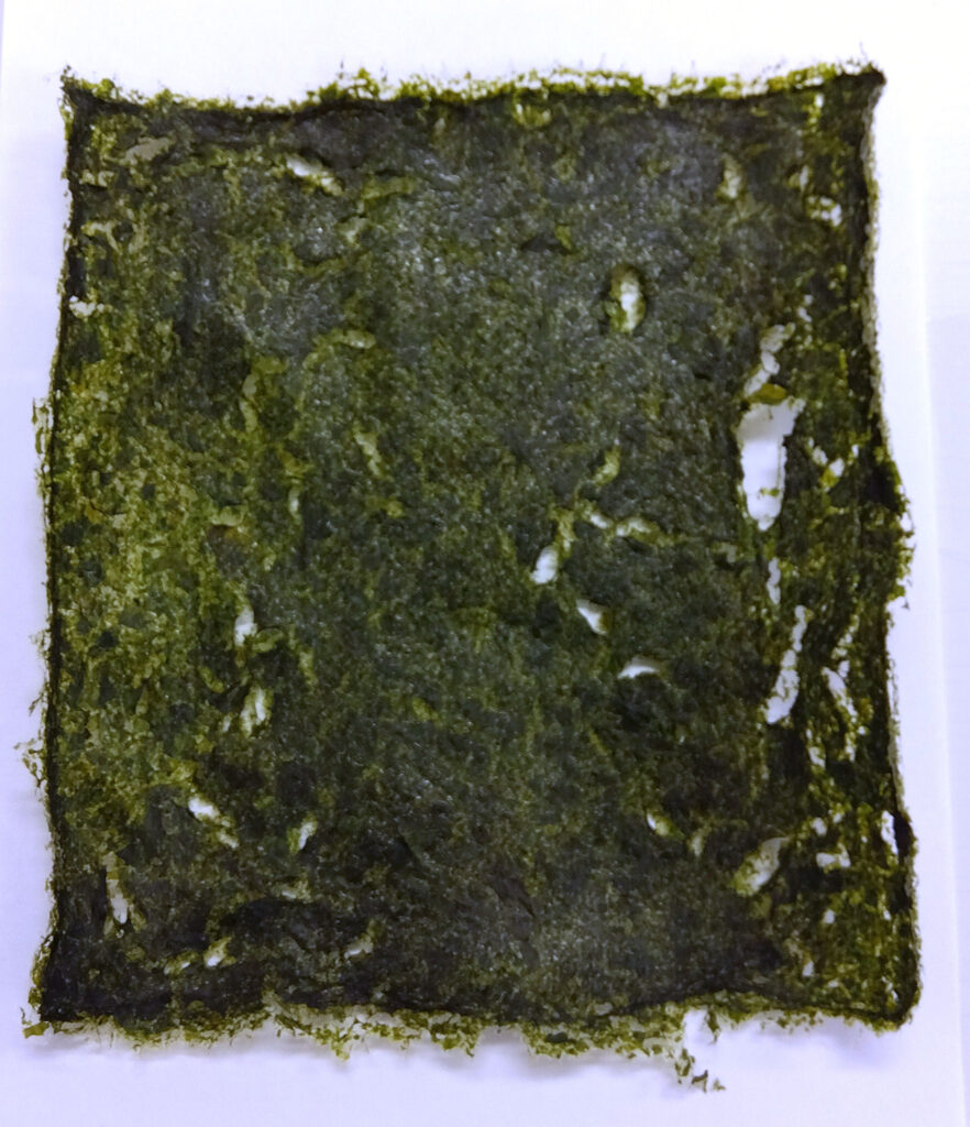 最近、コンビニでも海苔のないおにぎりが増えてきましたが、これは海苔の生産量が近年激減し、価格上昇していることなどが関係しているものと思われます。そこで今回は、コンブの生産過程で発生する「間引きコンブ(※太いコンブを生産するため途中で間引かれたコンブ)」に着目、これを加工してヨウ素を除去したものを「スマートコンブ」と命名し、海苔の代替品として活用する実験を試みました。